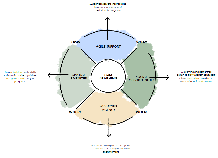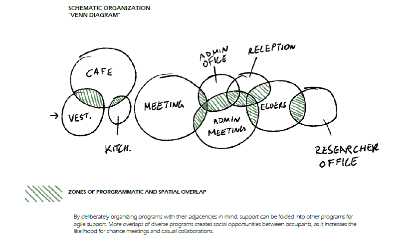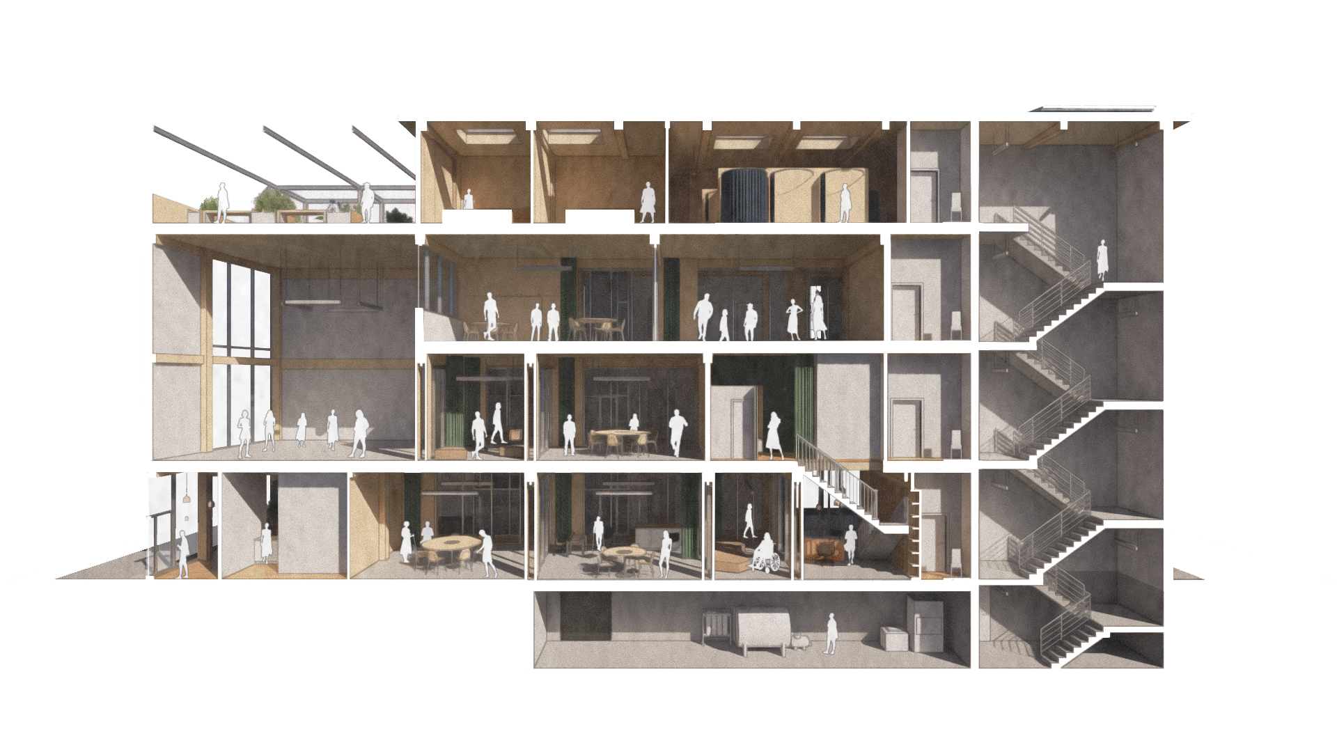 Co-Collage: Dialogue and Collaboration Center is a place for anyone to come and learn from each other. It promotes continuous learning, social connection, and a place for anyone. People are invited to come find a place, and modify their space, giving the occupants freedom and choice in their own experiences. Programmatic adjacencies become places of intersection; where what might usually be a wall keeping two conversations apart, have the option to transform and allow groups to mix with one another. It is a place that offers an opportunity for the overlapping of space, and the overlapping of people. The architecture offers tools to create and manipulate spaces, to open new opportunities as to where, how, what and with whom conversations might happen.