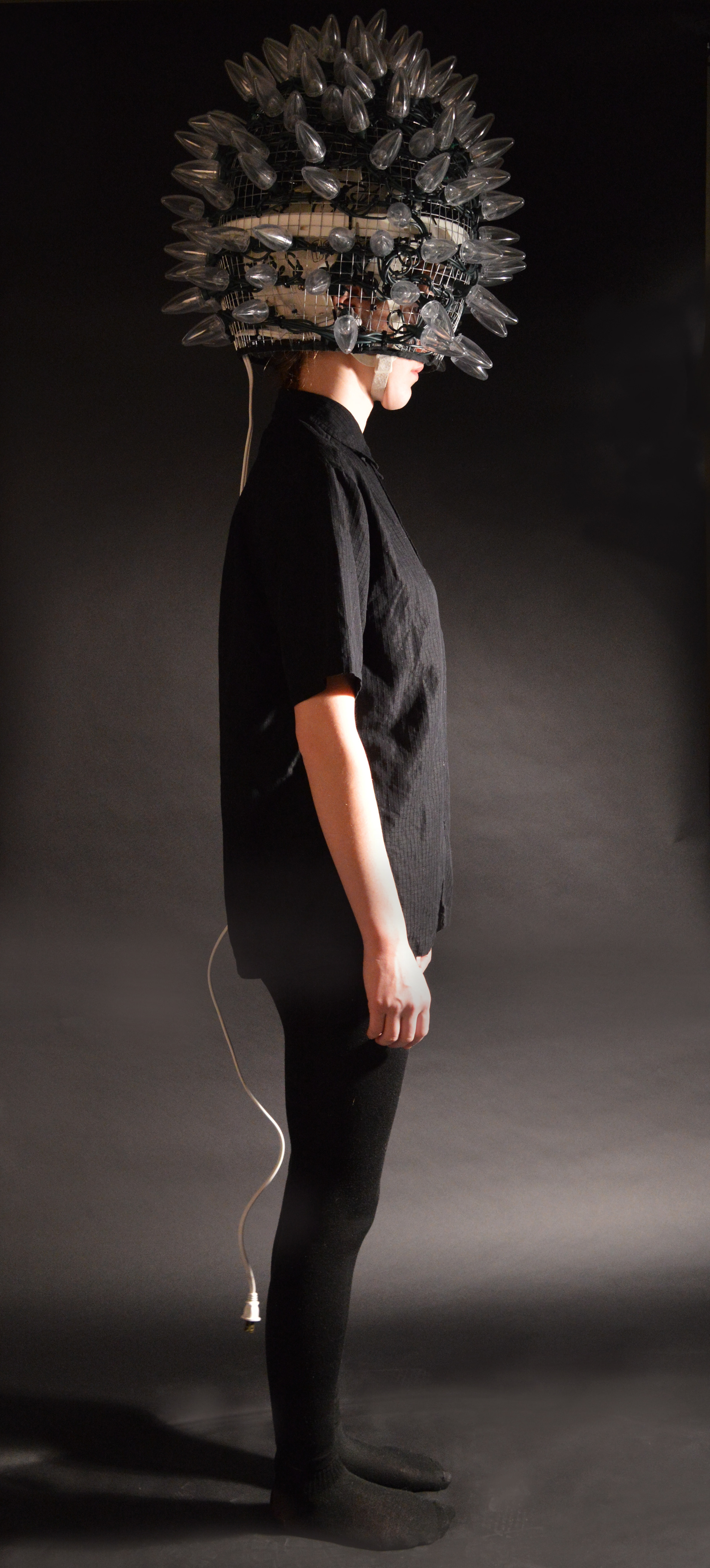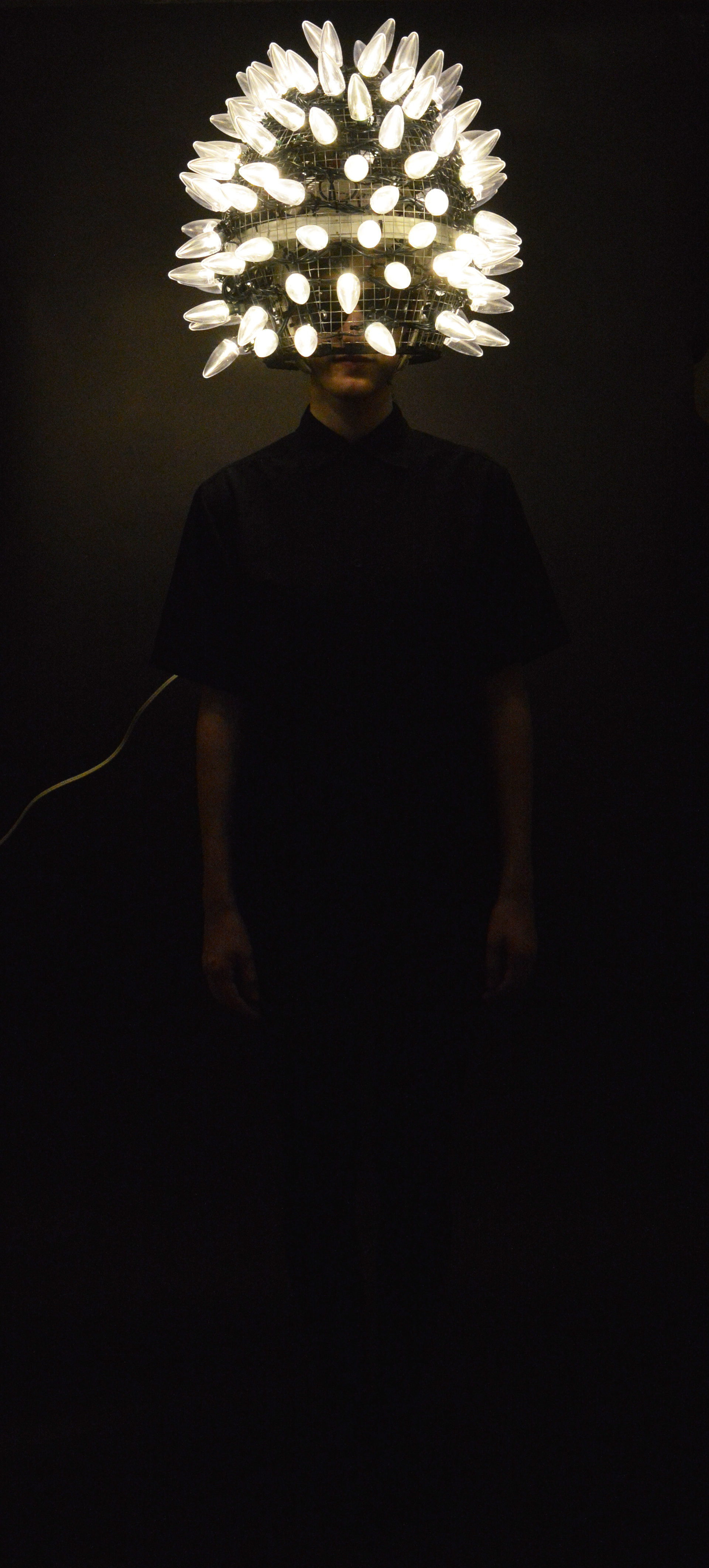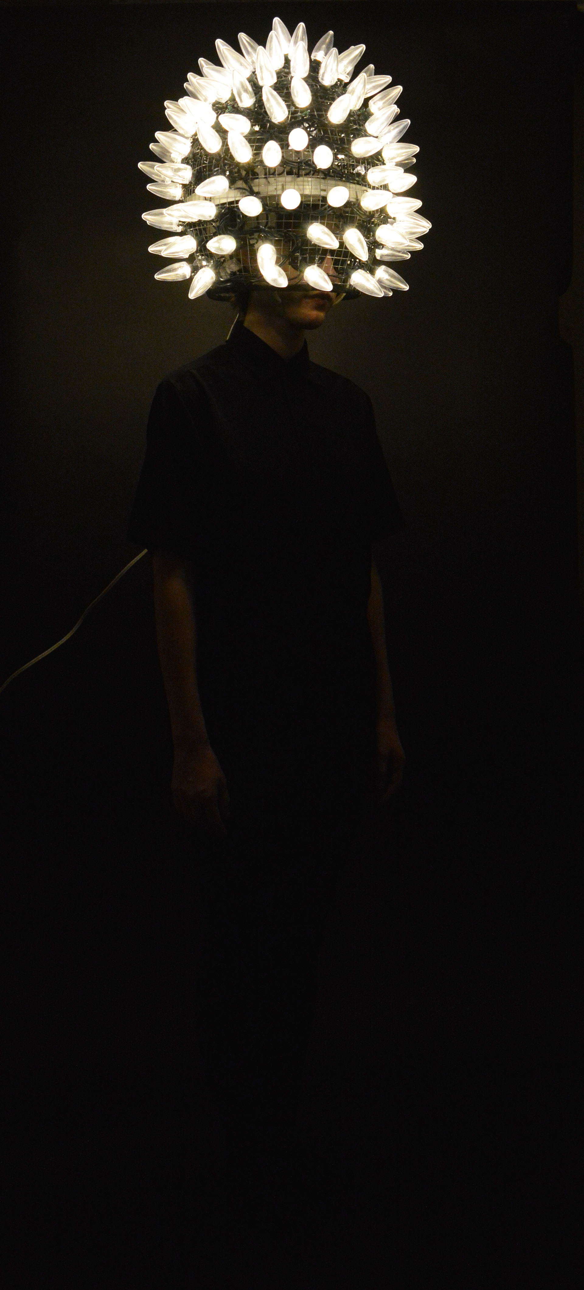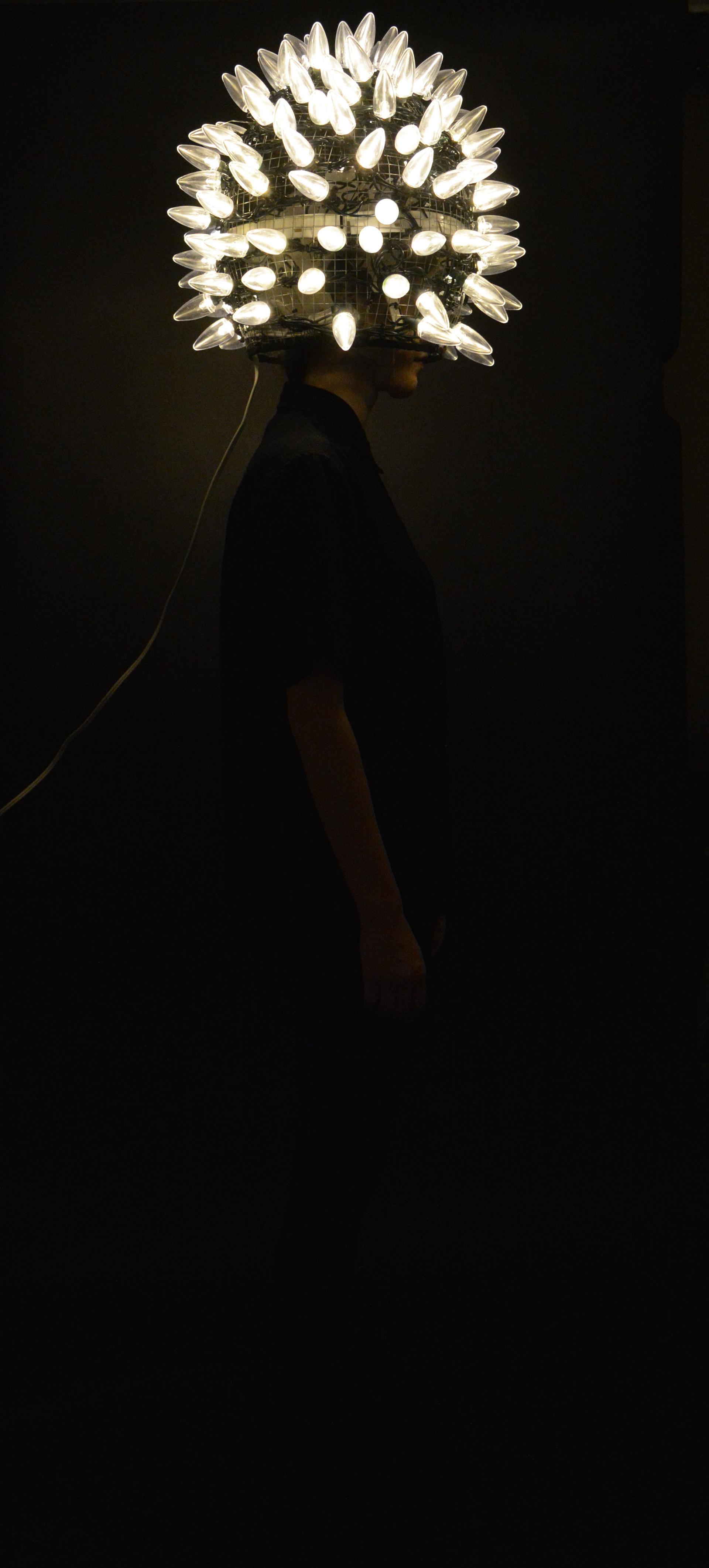 Light headed a wearable sculpture constructed from a a metal cage laced with 125 light bulbs mounted on a helmet. The wearer becomes the host for the glow of light, however only if they chose to be tethered by a power source.