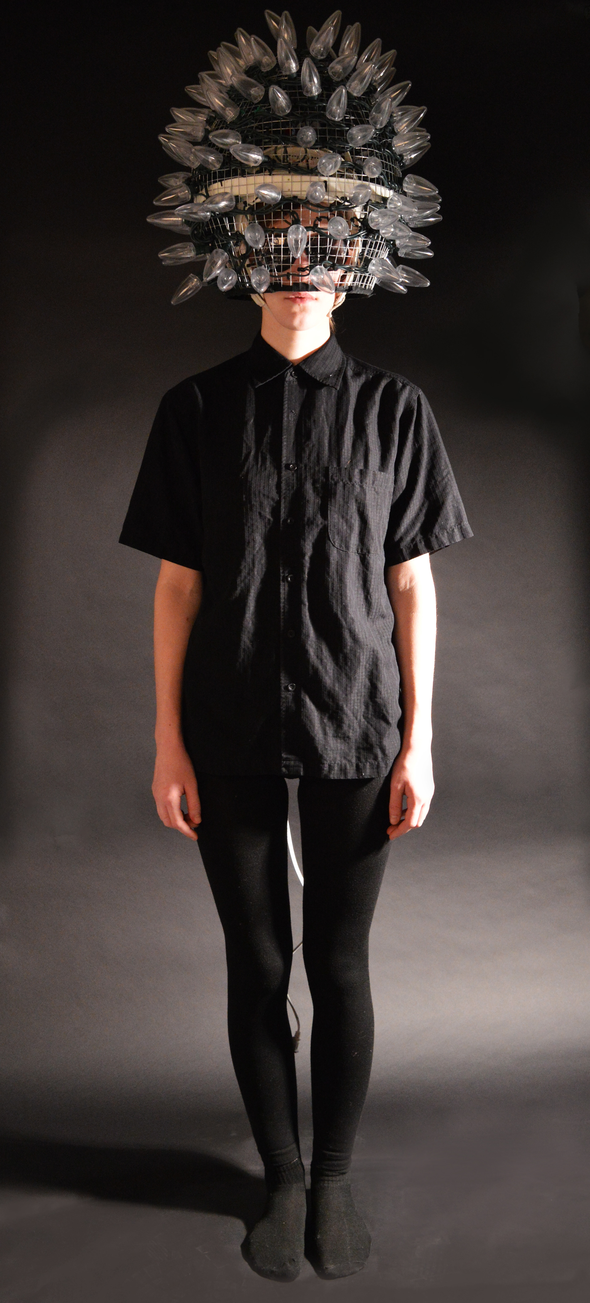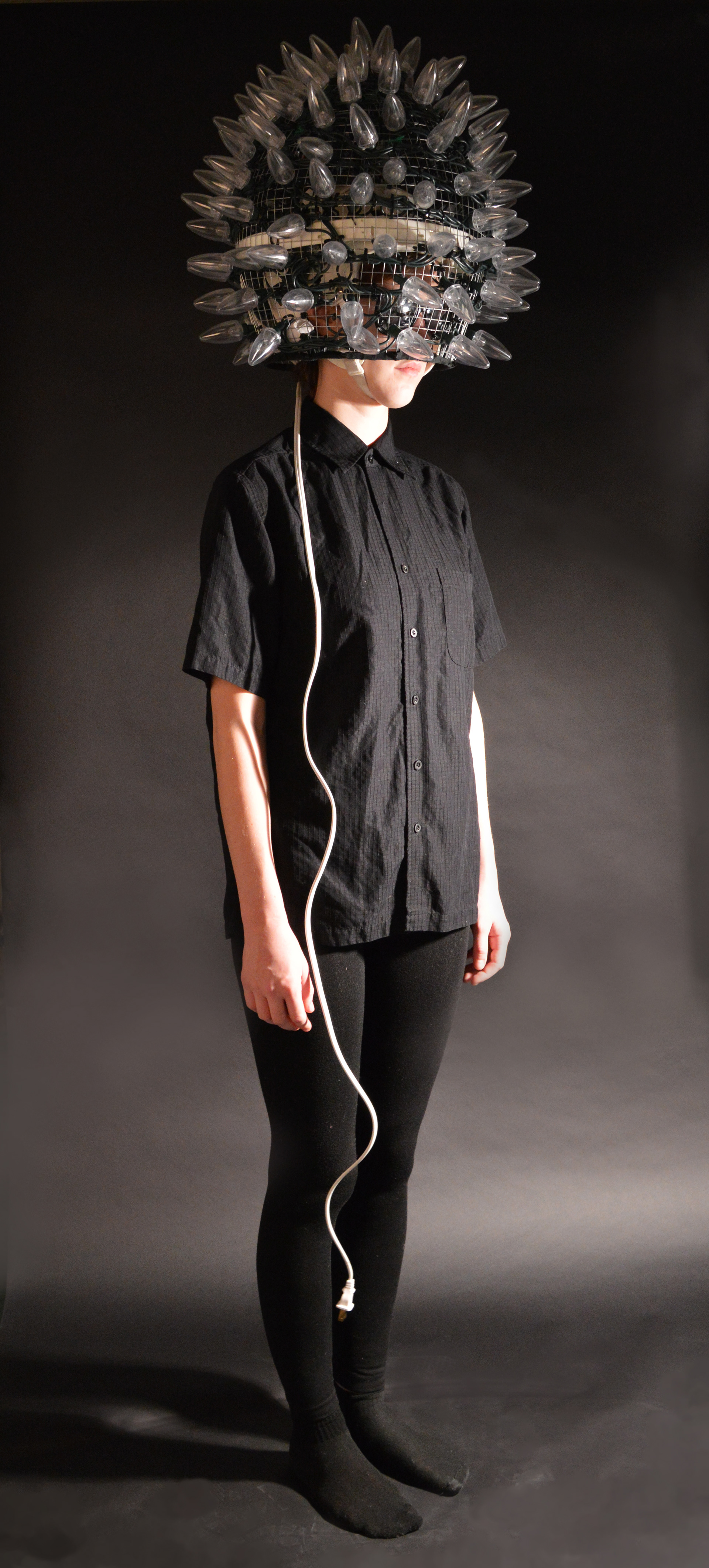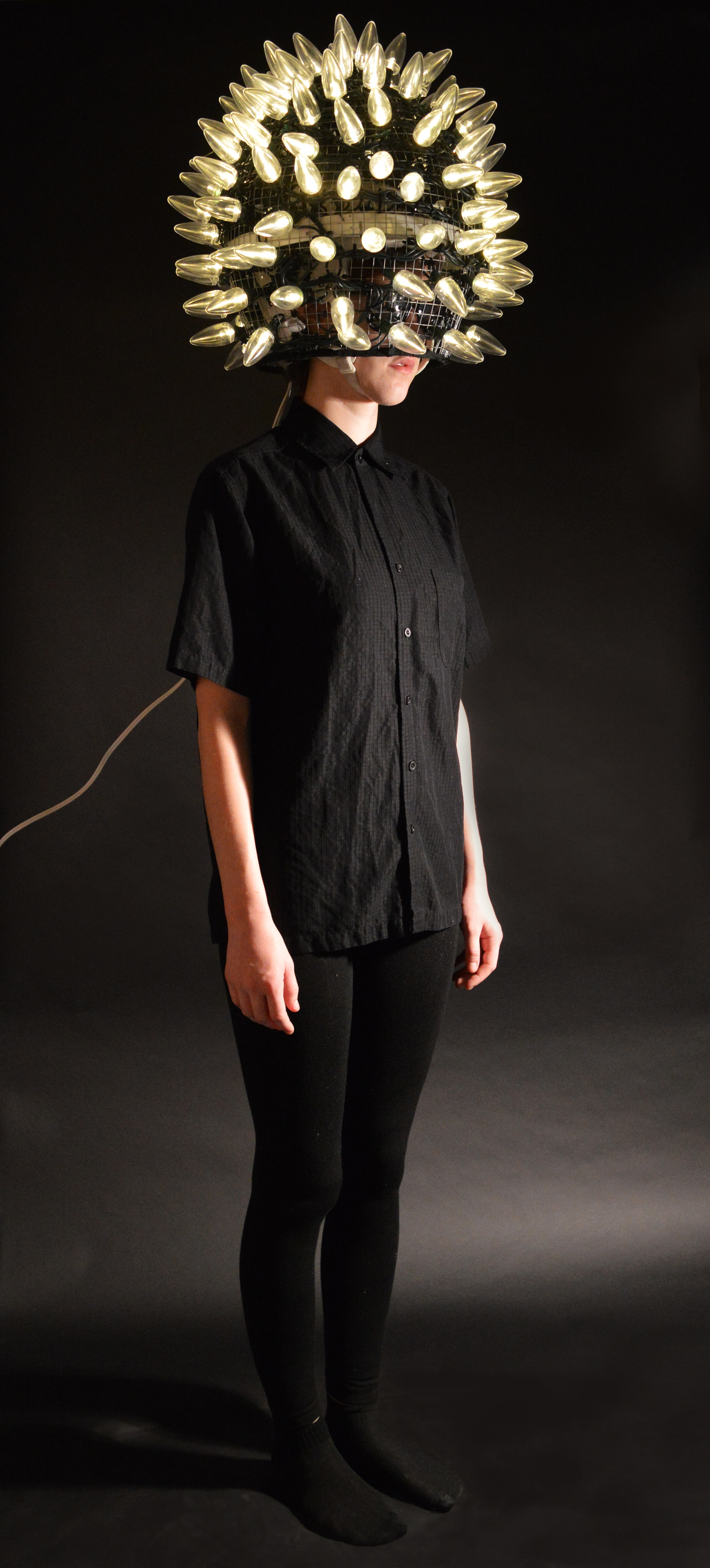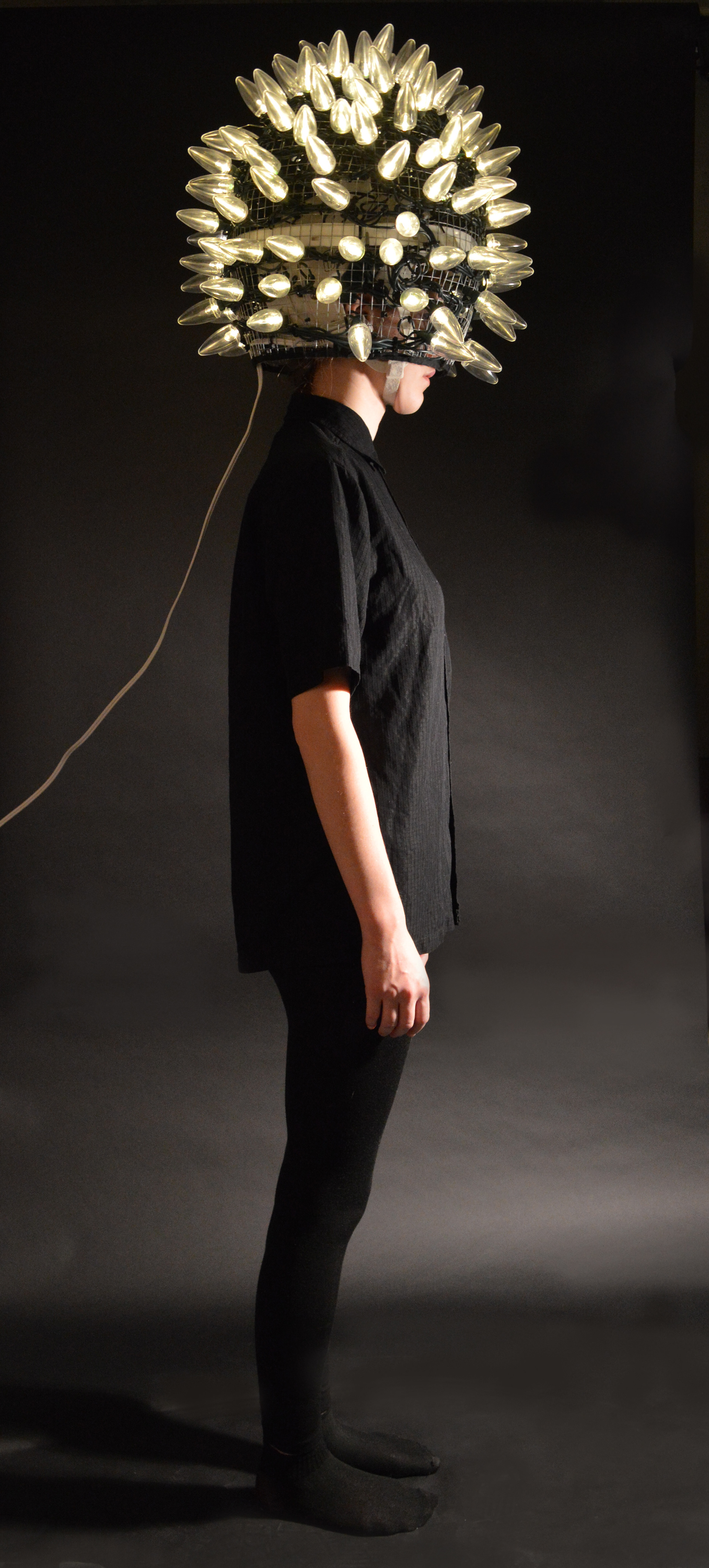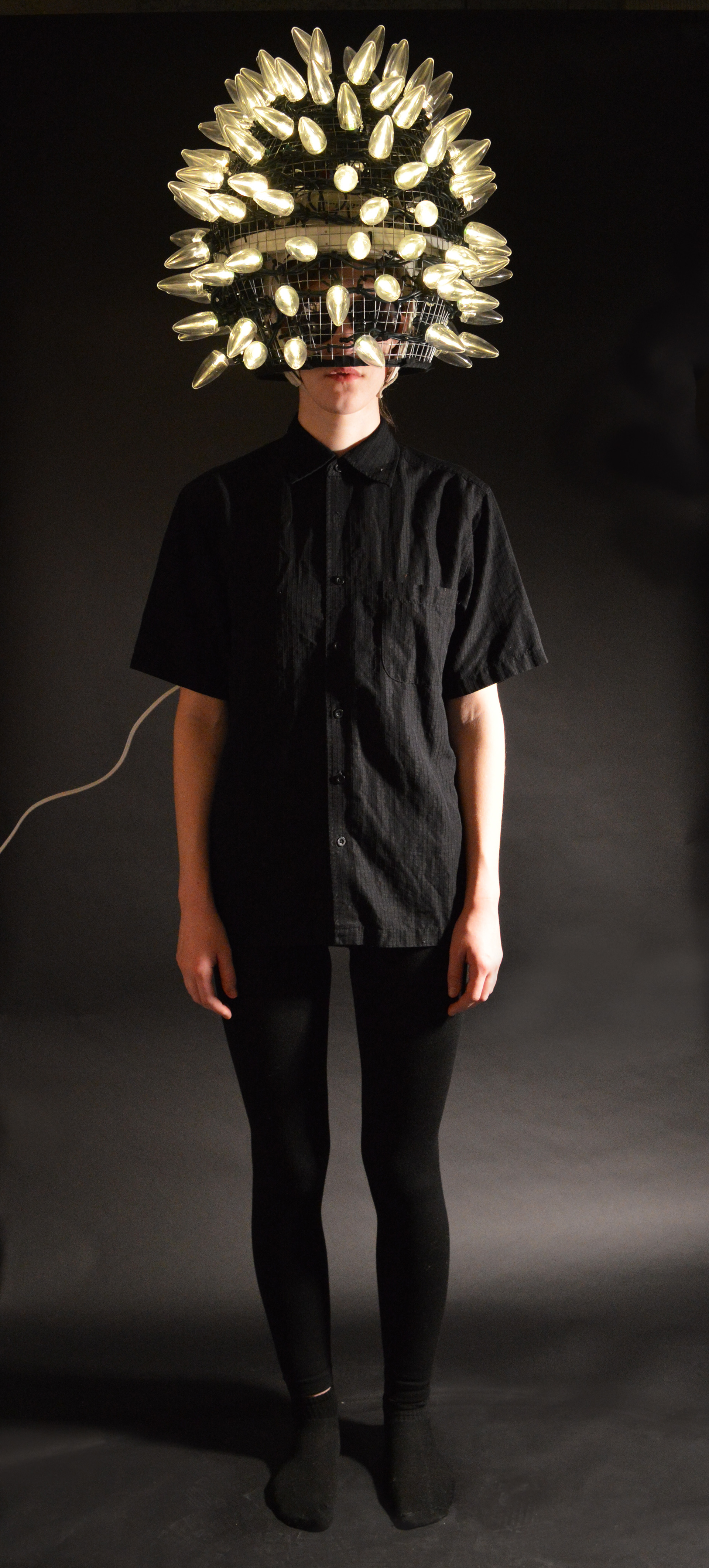 Light headed a wearable sculpture constructed from a a metal cage laced with 125 light bulbs mounted on a helmet. The wearer becomes the host for the glow of light, however only if they chose to be tethered by a power source.