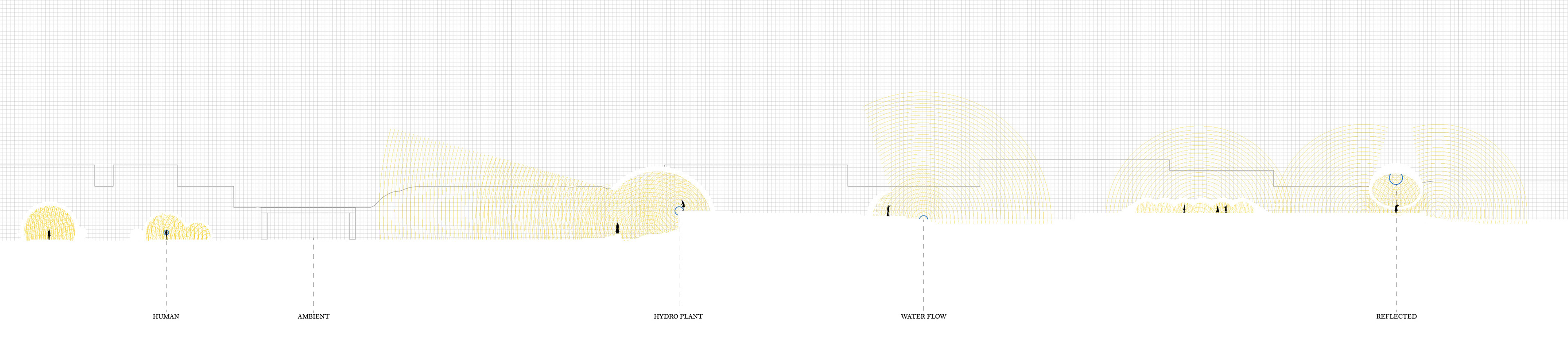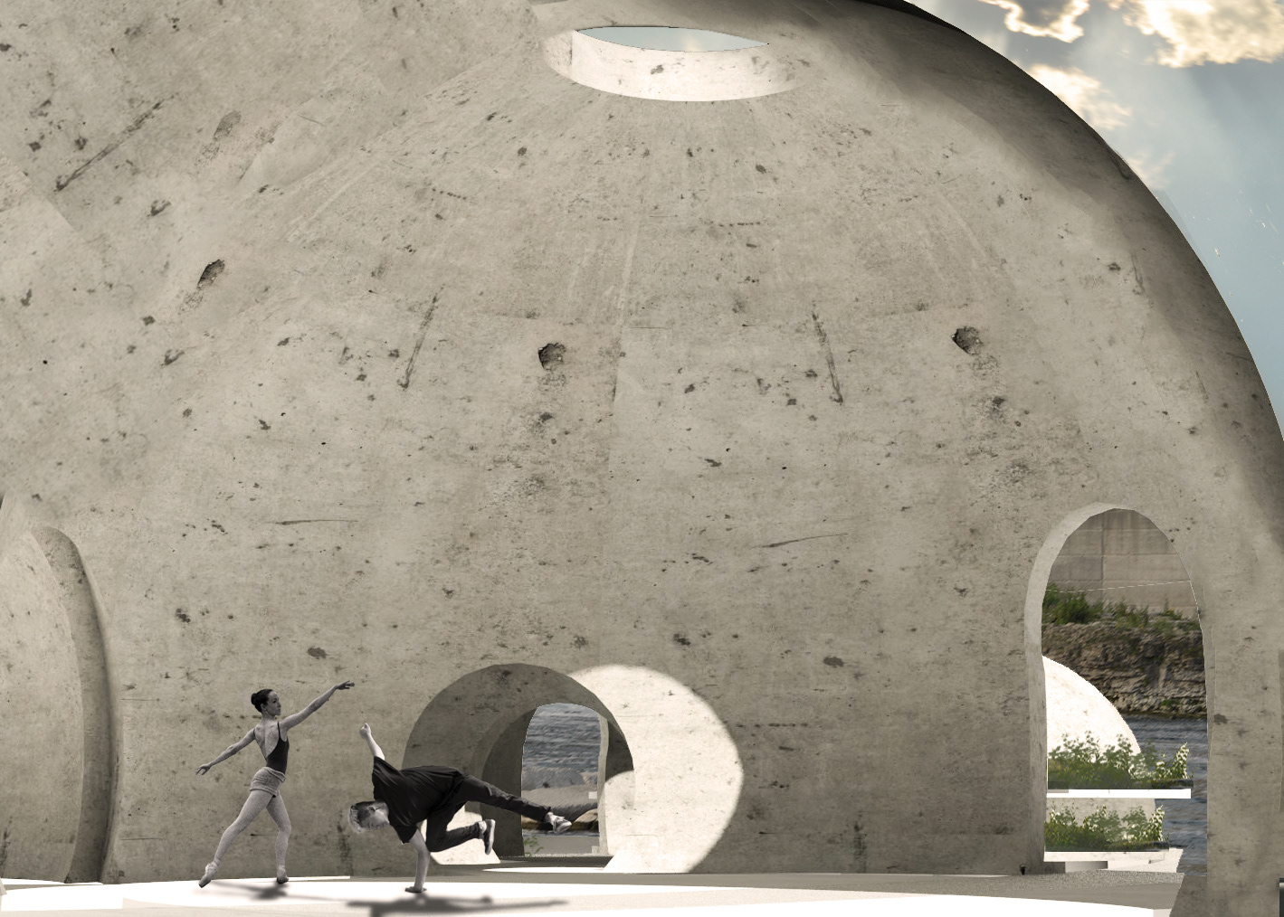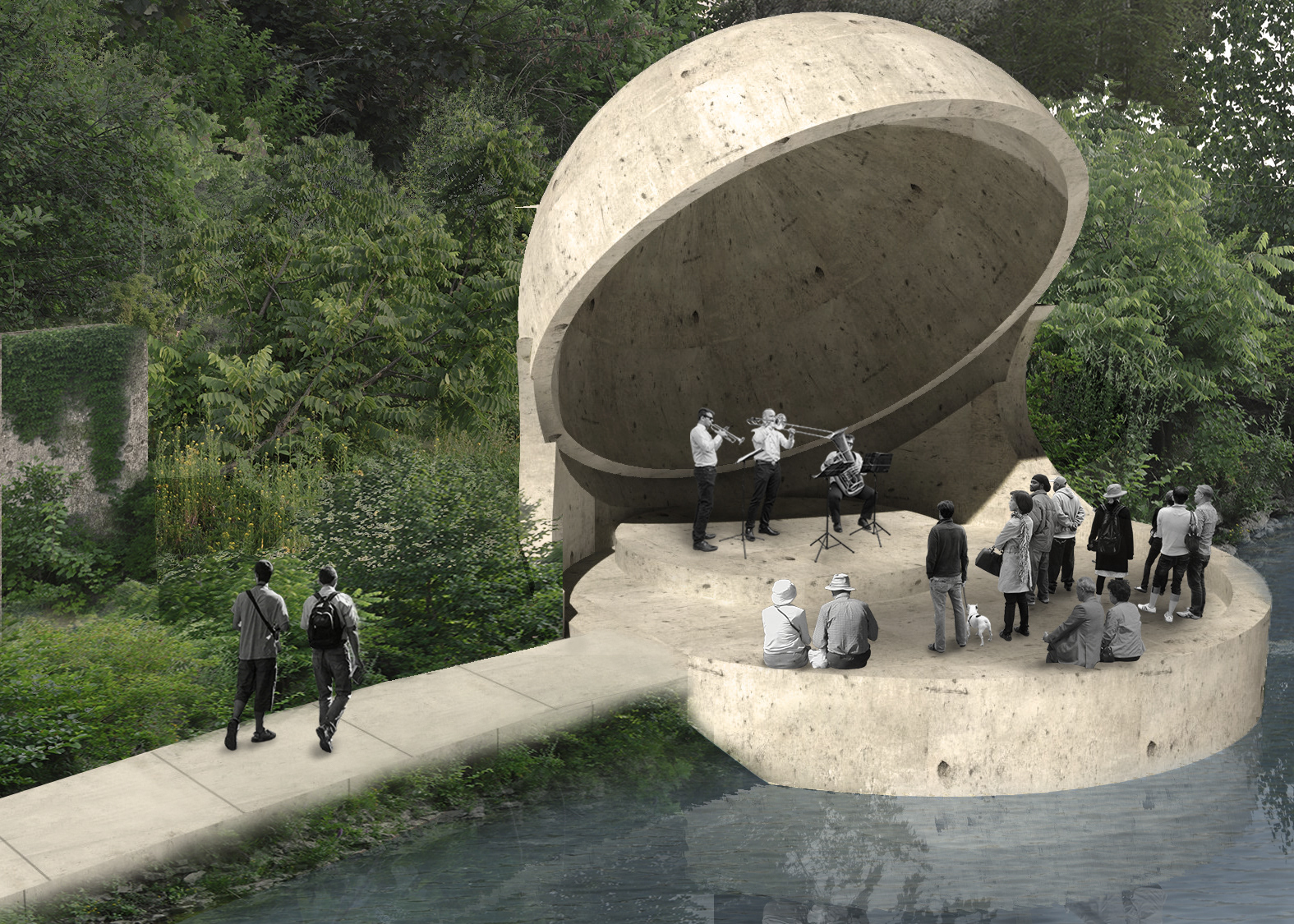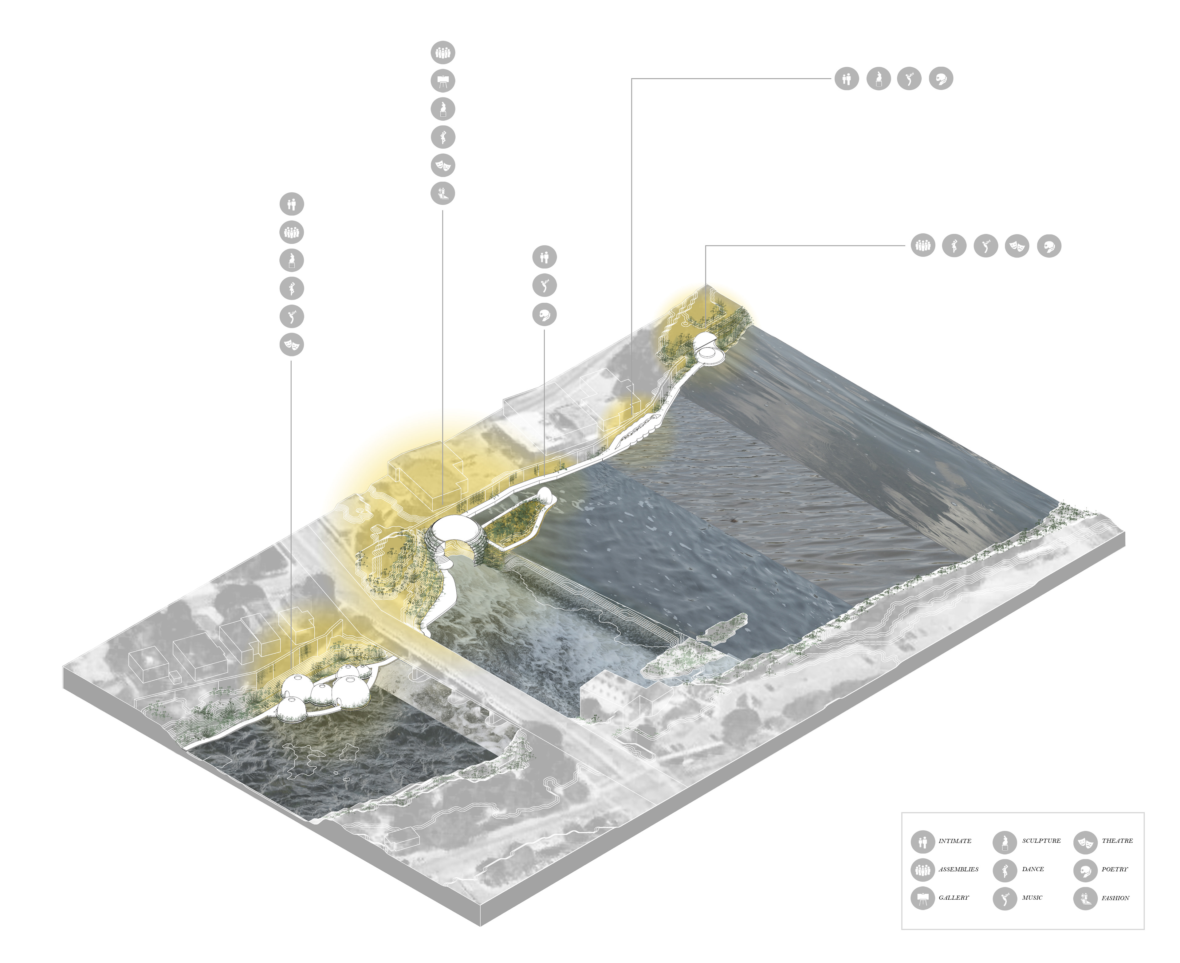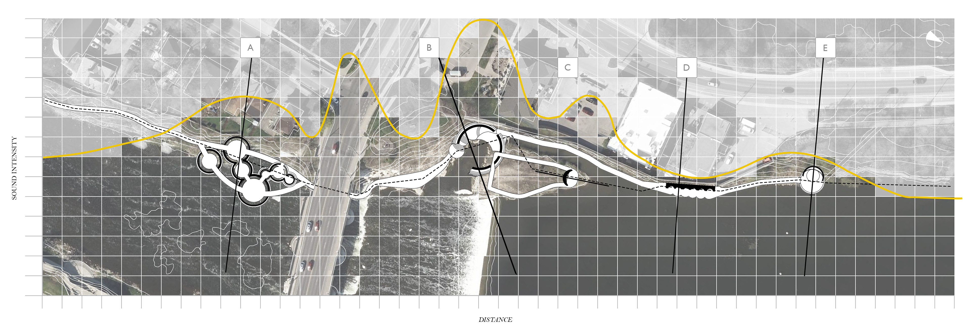 Soundscape is an exhibition park created alongside the Grand River in Cambridge, Ontario. Via a series of monolithic concrete structures, unique auditory environments are revealed; creating a new relationship between the rivers edge and the visitors. Determined by the shape and size of the concrete forms, the volumes are matched with a pre-existing auditory condition along the riverside; ranging from light trickles down the river, to raging waters spit from the hydro dam. These natural conditions are modified by the form encapsulating them, whether amplifying, resonating, reverberating, diffusing, or reflecting. A second layer of experience is added with the interaction of the user. The spaces, suggested by the sound qualities crafted, become an opportunity for an exhibition space, of various art forms.The spaces are fully activated with occupation, allowing the user to explore the sound qualities of nature, the imposed architectural form, and their own ability to contribute. The forms host and elevate pre-existing conditions of the natural conditions as well as give opportunity for exhibitions, creating a new appreciation and relationship to the waterside.