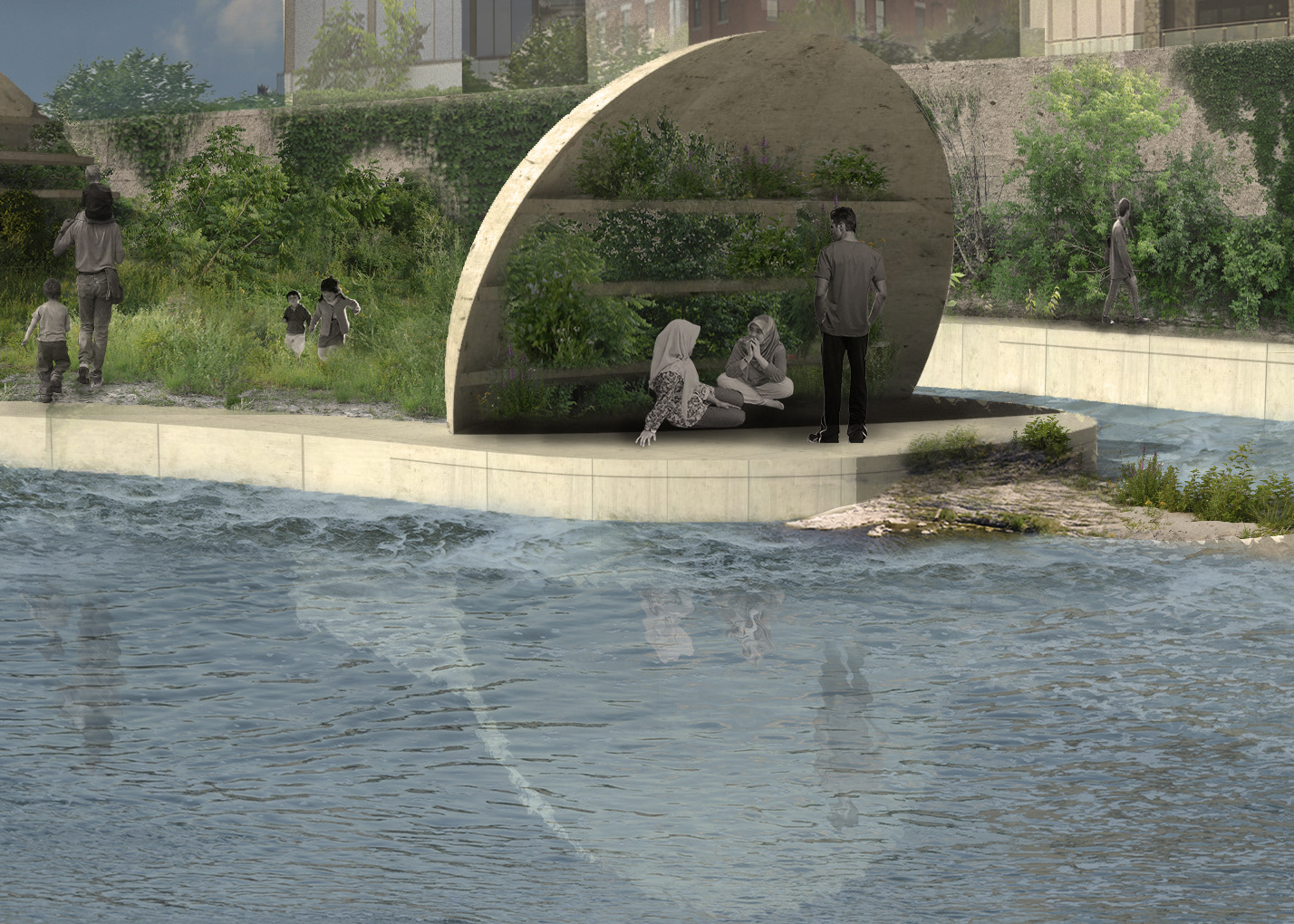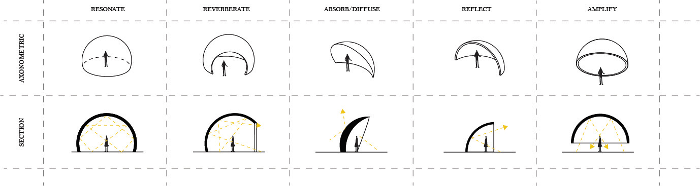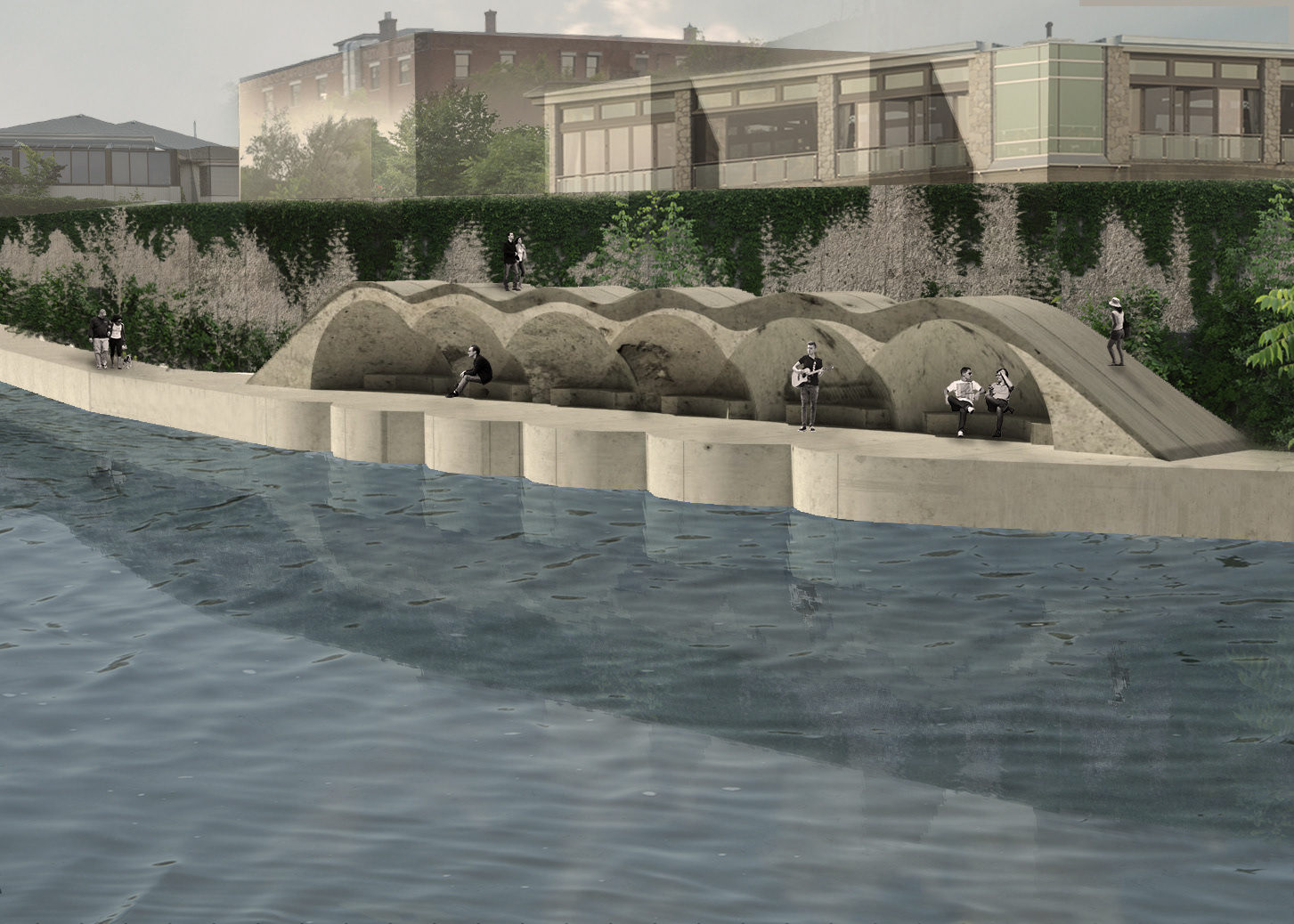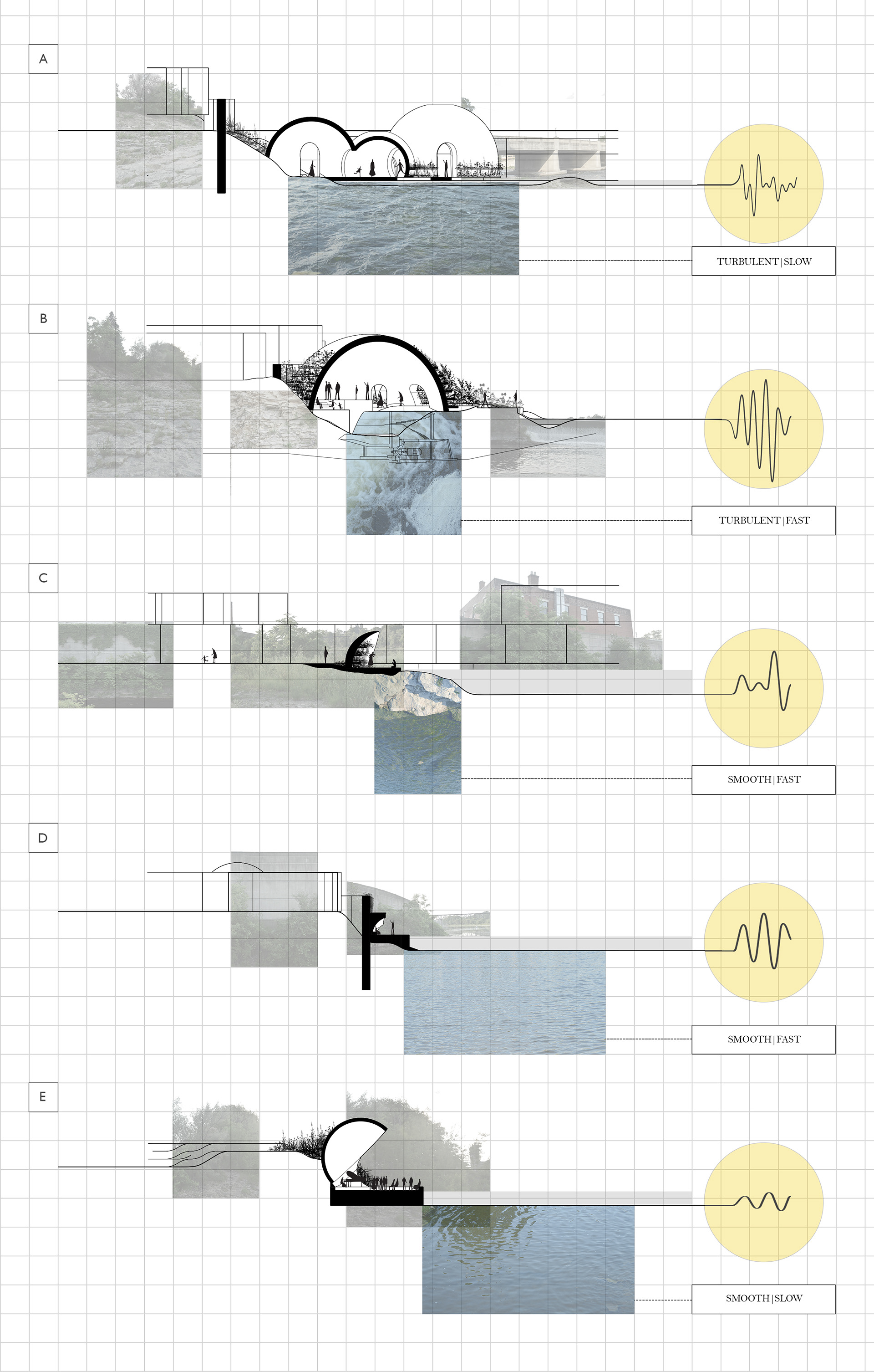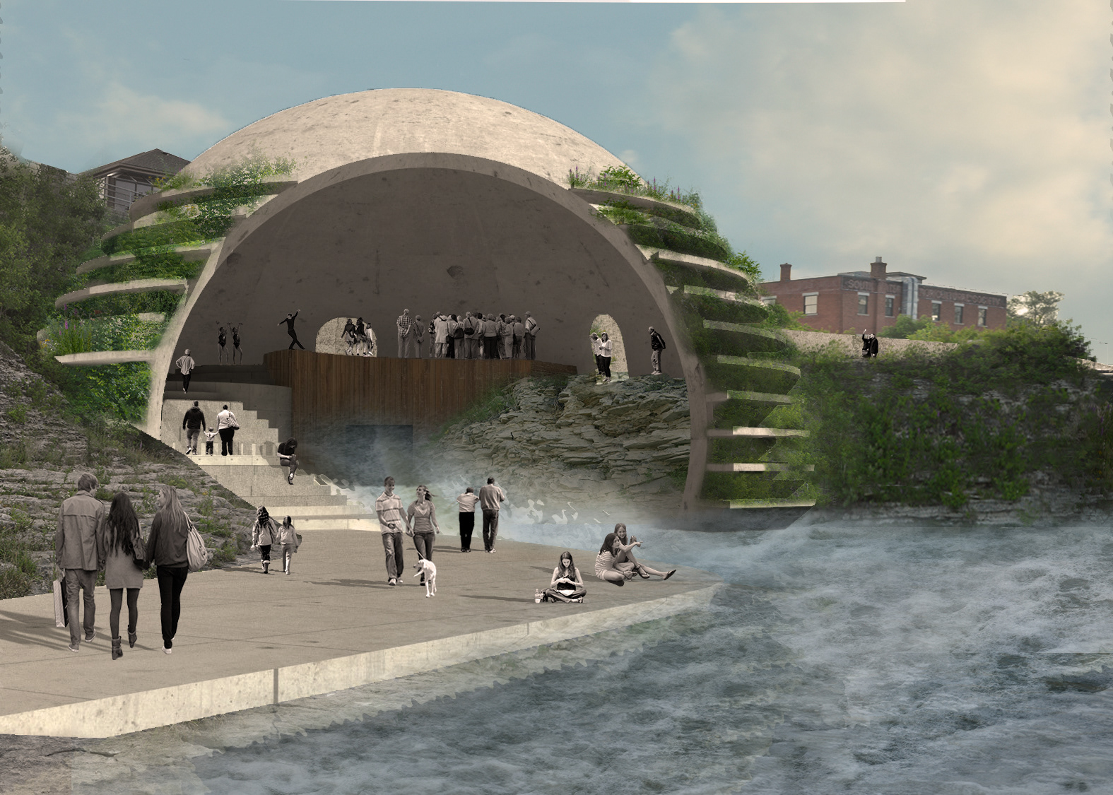 Soundscape is an exhibition park created alongside the Grand River in Cambridge, Ontario. Via a series of monolithic concrete structures, unique auditory environments are revealed; creating a new relationship between the rivers edge and the visitors. Determined by the shape and size of the concrete forms, the volumes are matched with a pre-existing auditory condition along the riverside; ranging from light trickles down the river, to raging waters spit from the hydro dam. These natural conditions are modified by the form encapsulating them, whether amplifying, resonating, reverberating, diffusing, or reflecting. A second layer of experience is added with the interaction of the user. The spaces, suggested by the sound qualities crafted, become an opportunity for an exhibition space, of various art forms.The spaces are fully activated with occupation, allowing the user to explore the sound qualities of nature, the imposed architectural form, and their own ability to contribute. The forms host and elevate pre-existing conditions of the natural conditions as well as give opportunity for exhibitions, creating a new appreciation and relationship to the waterside.